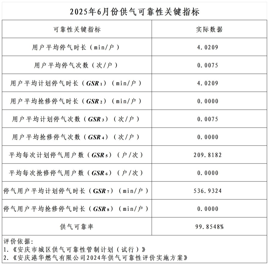 2025年6月份供氣可靠性關(guān)鍵指標(biāo)